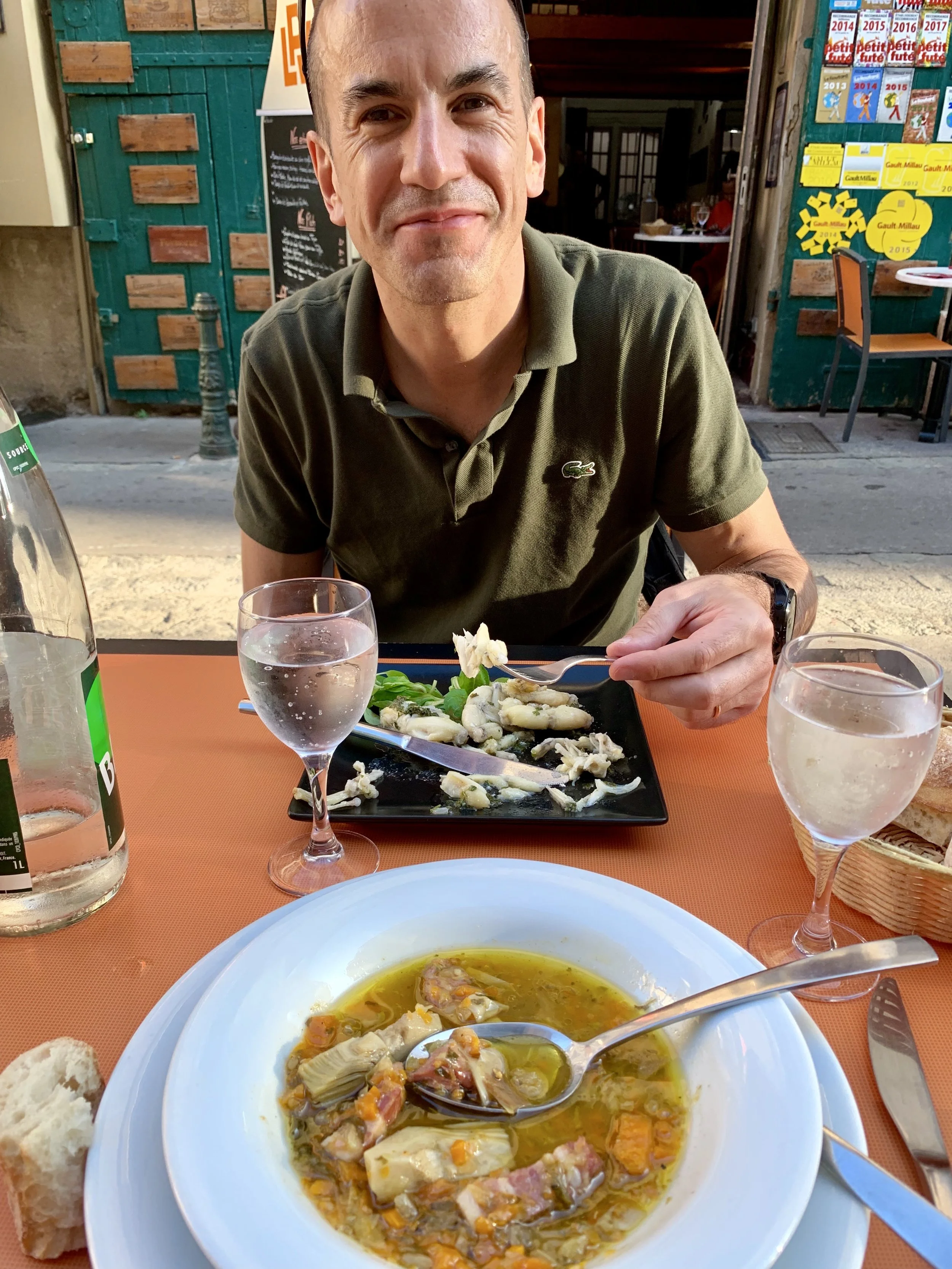 Le Renaissance in Gordes: Though we ventured into it with some skepticism, given this restaurant’s prime situation in a heavily touristed square in the center of the town, the fare and the service pleasantly surprised us—as did the playlist of Ray Charles classics. My roast chicken and salad came plentiful and delicious, and Arnaud enjoyed the rich flavors of his beef carpaccio with fries.