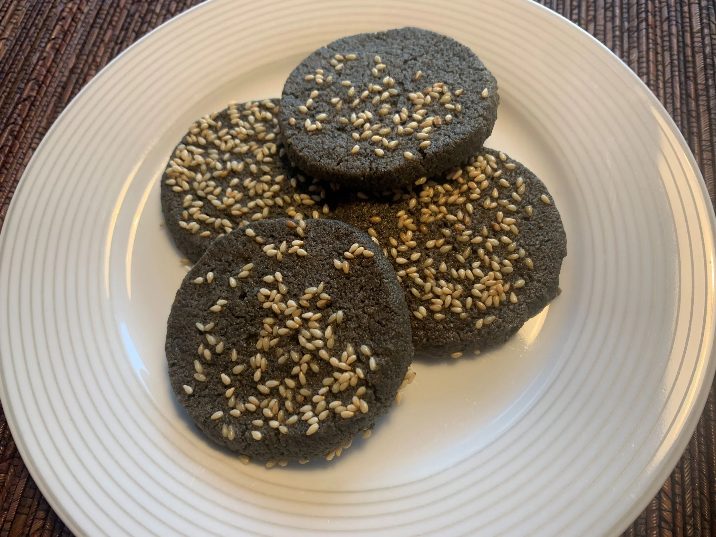 My dessert course of black-sesame shortbread cookies. Lausanne, Switzerland. November 23, 2023.